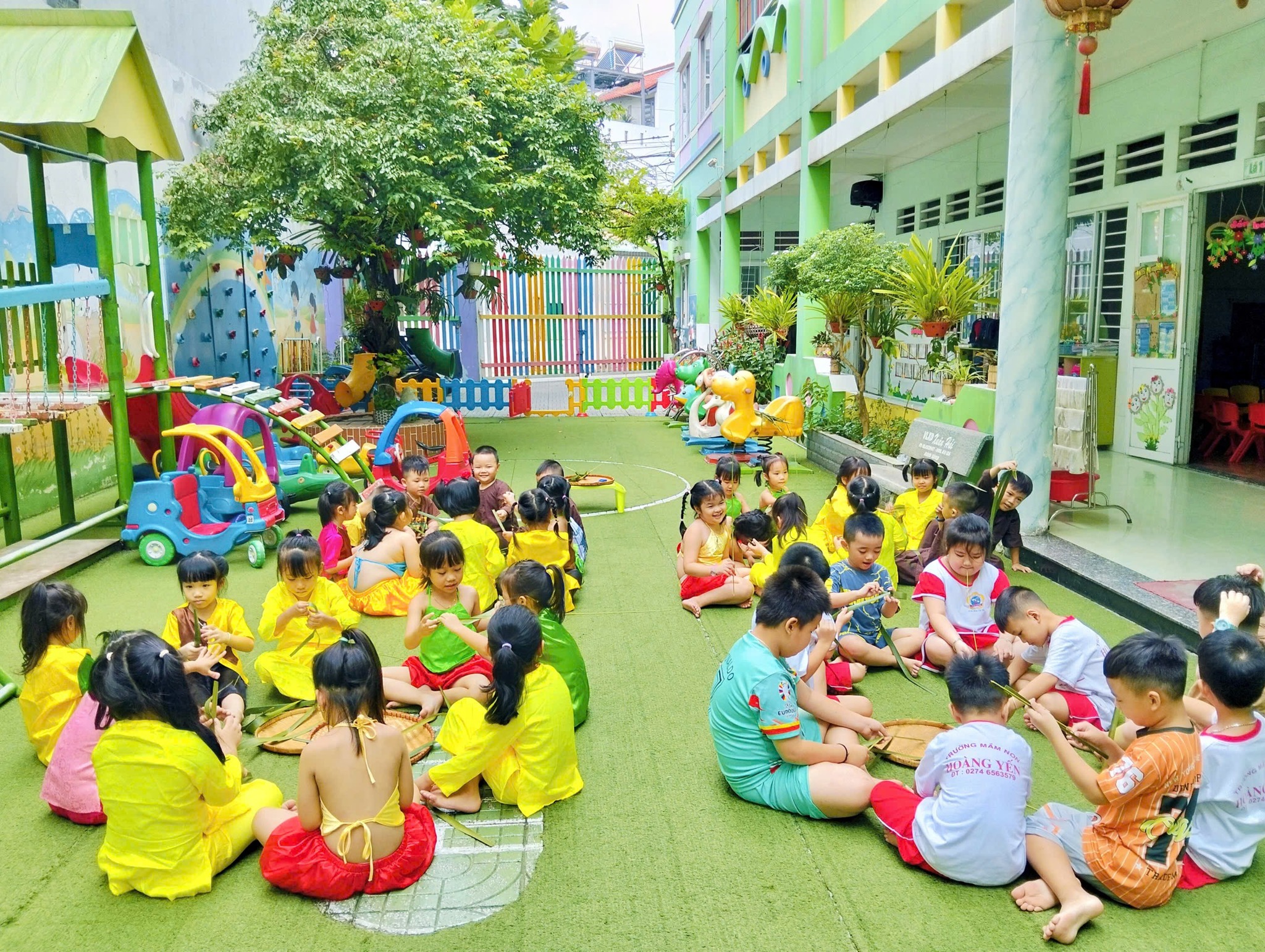 - Hoạt động giúp trẻ phát huy khả năng sáng tạo, thoả mãn nhu cầu vui chơi của trẻ. Với ưu thế “môi trường xanh” trong khuôn viên nhà trường, trẻ được làm quen với nhiều loại lá cây như: lá cây xa kê,lá cây khế ,lá cây hoa giấy… ....mỗi loại lá trẻ sẽ được sáng tạo ra những món đồ chơi riêng.